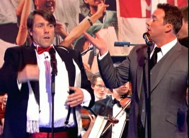 Lee Mack (for the Blue Team) and John Bishop (for the Red Team) each took a turn. Russell led them into the final note, then left them to it. The longer the note was held, the more time there was for their team-mates to answer questions, but they also had to compete with the orchestra at full volume!